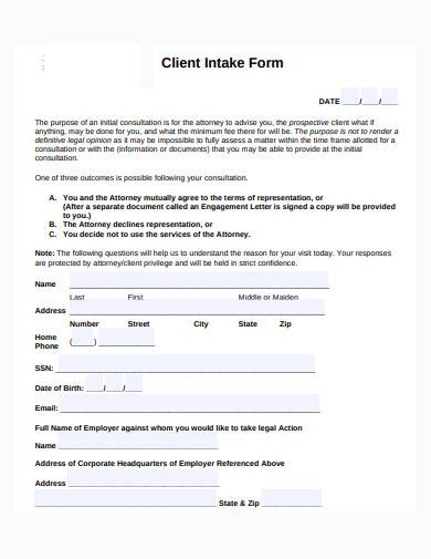 In law, as in life, first impressions last. The client intake form is the first look a new client has into how your firm works and it sets . Client intake has to go beyond getting clients to fill out a form or jotting down information on a legal pad that later gets passed around the office. By downloading our client intake form, and sending it to us in advance of your initial meeting with your lawyer, we can be better prepared to assist you. Law firm, so we hope these forms, checklists, and pamphlets are helpful.